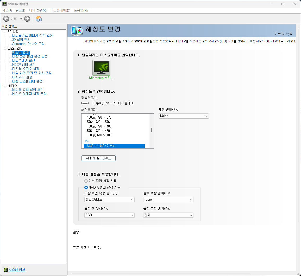 10bit 색상 설정을 위해 NVIDIA 제어판에서 출력 색상 깊이를 설정해 마무리.