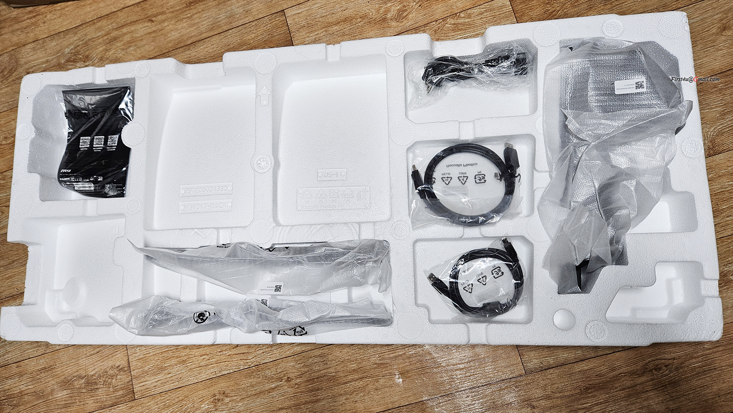 제품에 포함된 스탠드, USB케이블, 파워케이블, DP케이블, 나사 및 간편 안내서