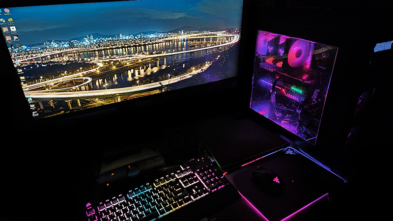 21:9비율의 모니터에 직접찍은 야경 파노라마 사진을 배경으로 전체 시스템 사진을 찍어 봤습니다 :)